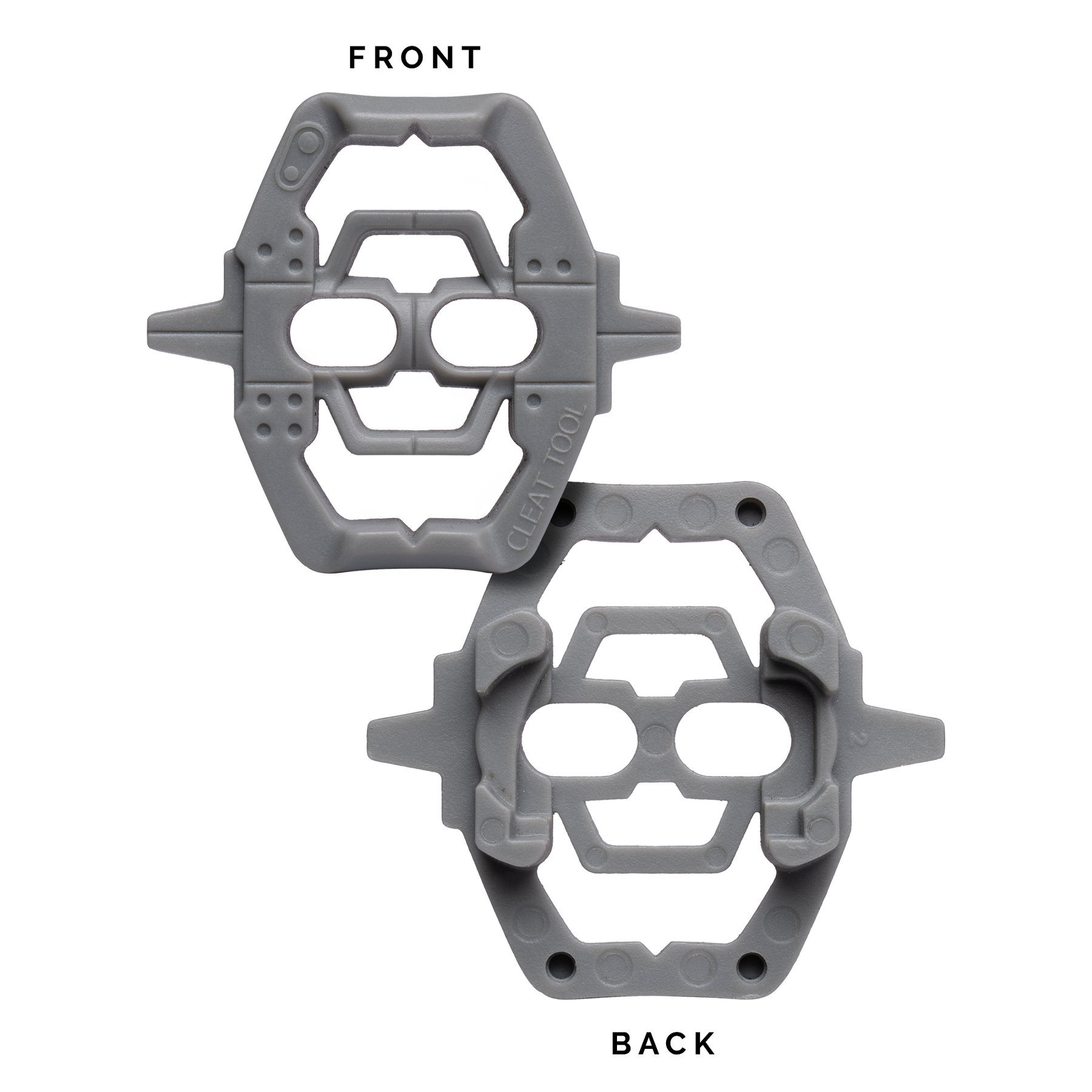 Our new cleat tool is designed to simplify the cleat installation process, and is ideal for dialing in cleat placement for both left and right shoes (or across multiple pairs of shoes). The visual guides built into the tool allow the rider to consistently achieve their preferred lateral, fore/aft, and rotational cleat position, while the shape of the tool allows for increased leverage during installation to prevent accidental twisting. And, for Crankbrothers pedal users, the built-in tread depth gauge makes it easy to find the correct cleat shim thickness for an optimal shoe/pedal interface.