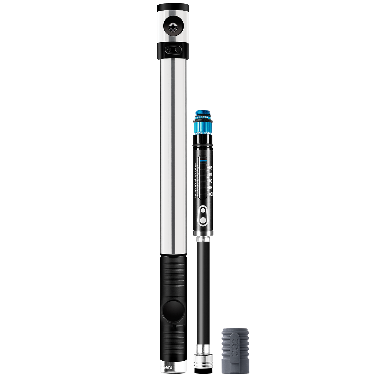 - Features also include a concealed co2 inflator (presta only), air pressure gauge, magnetic head with twisting collar, a folding and locking handle, and a presta/schrader valve adapter (fully threaded presta valve bodies only)