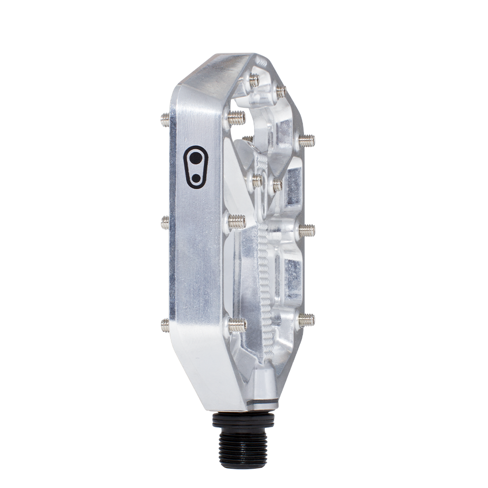 Size specific pro-level concave platform pedal provides optimal shoe/pedal interface.